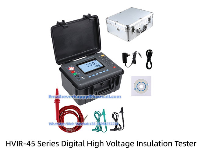 HVIR-45 Series Digital insulation resistance meter also known as megohmmeter, high voltage insulation resistance tester, etc., for the insulation resistance test. The instrument has a large LCD screen gray backlit display, data storage, data access, alarm, automatic shutdown and other functions. At the same time, it also has the function of measuring DC voltage, AC voltage, absorption ratio and polarization index of DC voltage. The machine is beautiful and upscale, has a wide range, high resolution, convenient operation, easy to carry, accurate, reliable, stable performance, strong anti-interference ability. Moreover, it has a shockproof, dustproof, moisture-proof structure and is a commonly used and indispensable instrument for telecommunications, electricity, meteorology, computer rooms, oil fields, electromechanical installation and maintenance, and industrial enterprises that use electricity as industrial power or energy. It is suitable for measuring the resistance value of various insulating materials and the insulation resistance of transformers, motors, cables and electrical equipment.At the same time, it can output a variety of different voltage levels with the step-adjusting voltage function (for example, 15KV models can generate 12KV levels, which can be used more widely).
